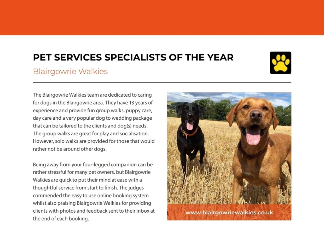Excellent service. Professional, helpful and reliable. I cannot speak highly enough of Blairgowrie Walkies - they do a fantastic job. My dog just loves going out with them.
